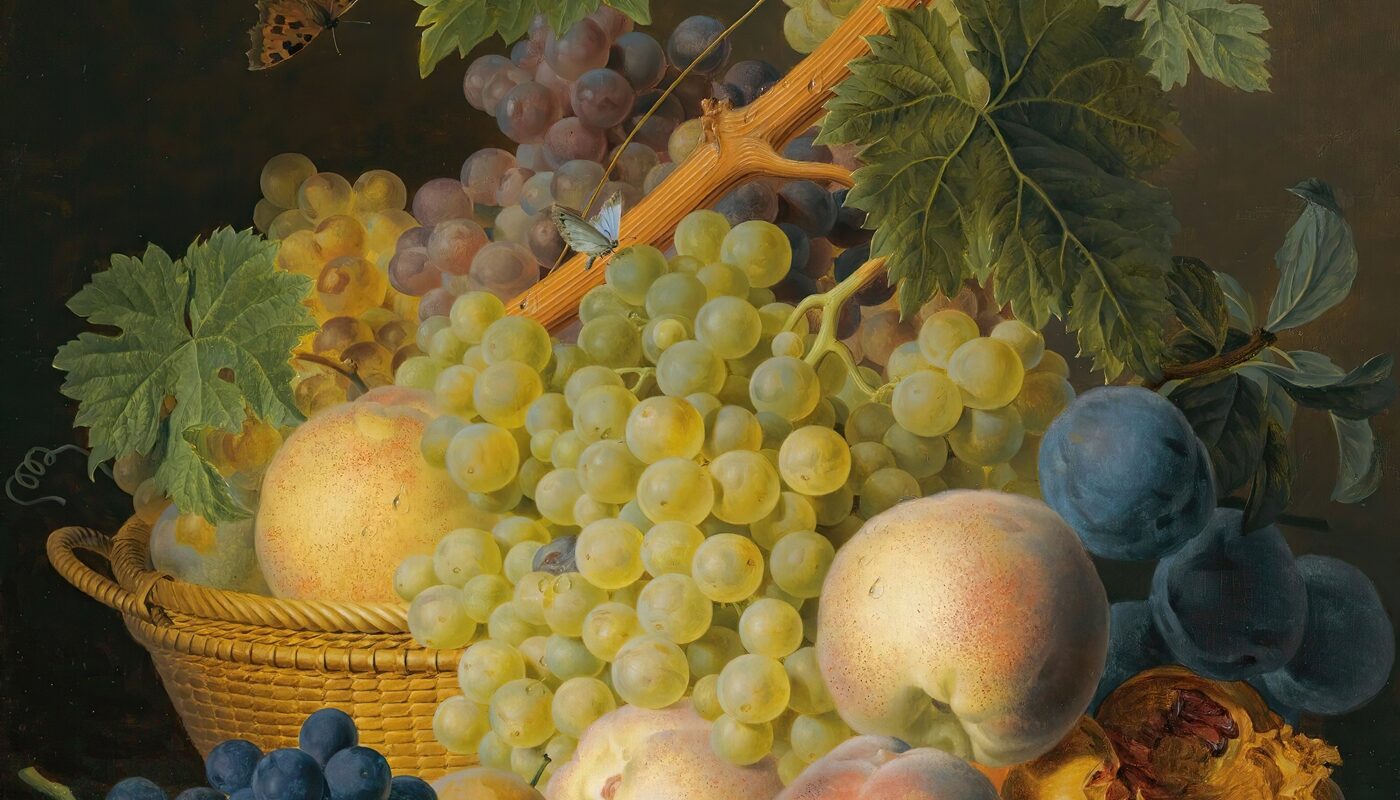 Image: A Still Life With Grapes And Peaches In A Basket, An Open Pomegranate, Plums, Black Grapes And More Peaches, All On A Marble Ledge. van Dael, Jan Frans. 1809.